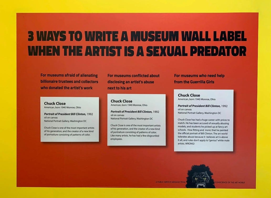 Aujourd’hui, à l’ère post-#MeToo, le collectif continue de frapper fort. En 2018, elles publient “Trois façons d’écrire un cartel de musée quand l’artiste est un prédateur sexuel”, pointant du doigt la complaisance des institutions envers les “génies” masculins malgré leurs actes de harcèlement.
